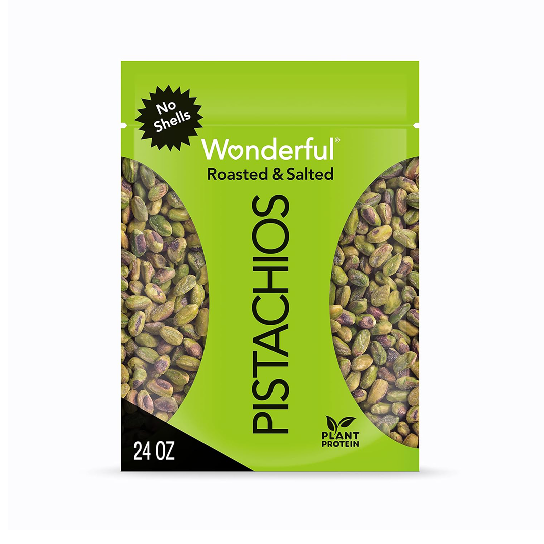 - SIZE: Net Wt 24 Ounce (1.5 lbs) 680 g No Shells – Our Wonderful Pistachios 24 ounce bag is the perfect snack to have around the house. Pistachios are gluten free, nutritious, & a protein powered snack. See nutrition information for fat content.